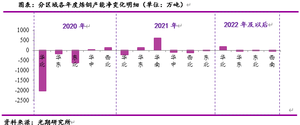 炼钢产能净变化方面,据统计,2020年华北是炼钢产能退出主要地区,华东及东北也有部分炼钢产能退出计划;2021年华北、华中及西北以退出产能为主,而华南则有明显的新增炼钢产能计划投产;2022年及以后华北地区有部分新增炼钢产能有待投产,华东、东北及西南仍以产能退出为主。