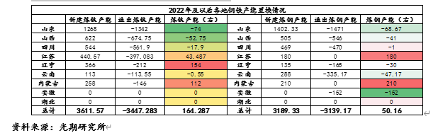 2022年及以后,据我们统计炼铁产能预计总共退出3447万吨,新建炼铁产能或将达到3612万吨,整体炼铁产能或增加164万吨;新增炼钢产能或达到3189万吨,计划退出炼钢产能3139万吨,整体新建炼钢产能50万吨。