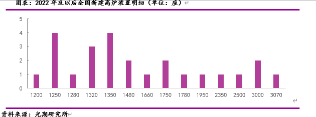 具体产能投放装置,2022年及以后,据统计拟新建高炉25座,高炉容积从1200m³至3070m³不等,总产能达到3612万吨,其中新建的1250m³及1350m³高炉数量最多,各有4座,其次是1320m³高炉,拟新建3座,这三种规模的高炉数量占2022年及以后投产高炉总数的44%,具体投产明细如下: