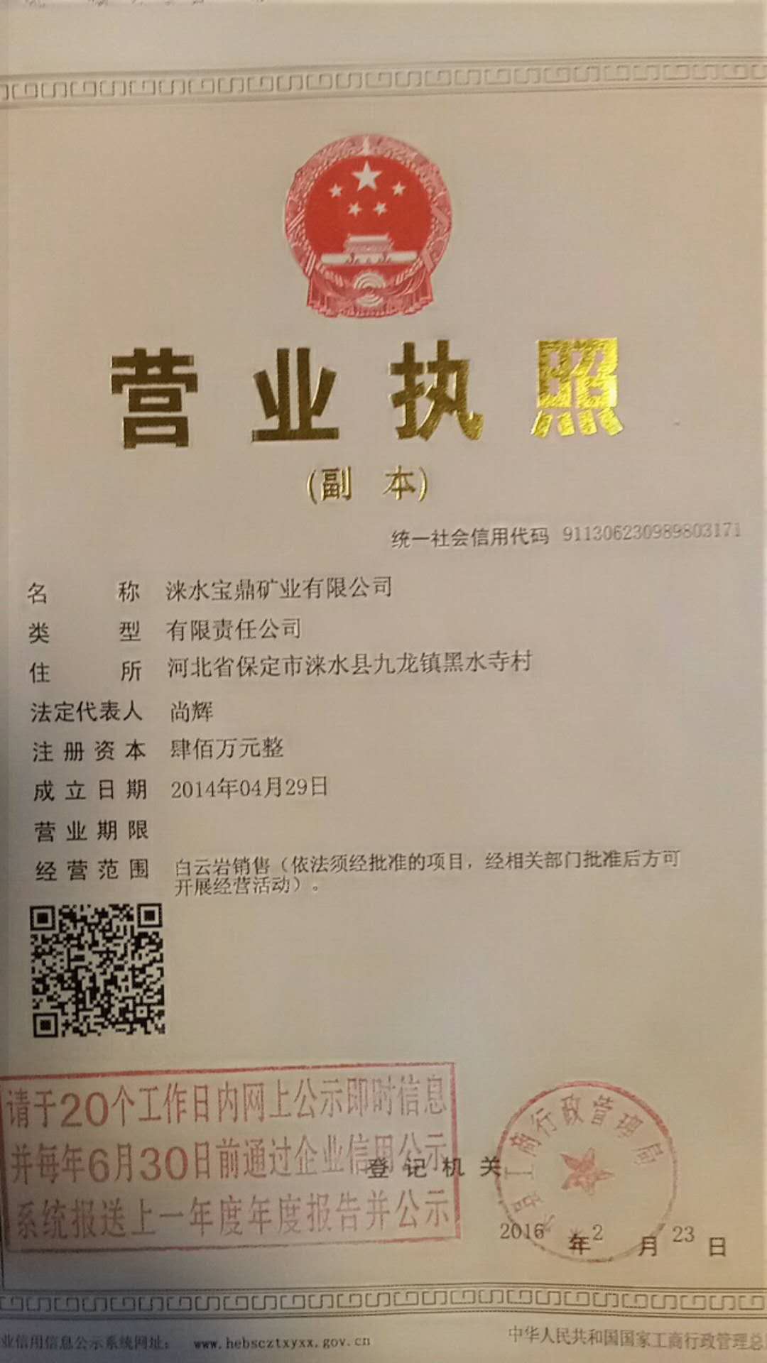 河北涞水一矿山企业矿权出售