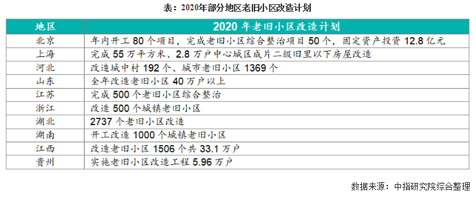 中指院指出,新开工改造城镇老旧小区3.9万个,涉及居民近700万户,比去年增加一倍,力度明显加大,改善居民居住条件的同时,亦可扩大内需,促进有效投资。2020年老旧小区将重点改造完善小区配套和市政基础设施,提升社区养老、托育、医疗等公共服务水平,在此过程中,亦为企业的介入创造了条件,特别是物业服务企业,市场空间也将得到进一步拓展。