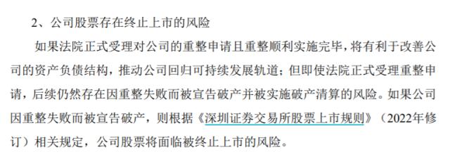 公告称,正邦科技已启动预重整,但能否进入重整程序存在不确定性。如果法院裁定受理申请人提出的重整申请,根据《深圳证券交易所股票上市规则》(2022 年修订)相关规定,深圳证券交易所将对公司股票交易实施退市风险警示。如果法院正式受理对正邦科技的重整申请且重整顺利实施完毕,将有利于改善其资产负债结构;但即使法院正式受理重整申请,后续仍然存在因重整失败而被宣告破产并被实施破产清算的风险。如果正邦科技因重整失败而被宣告破产,则根据《深圳证券交易所股票上市规则》(2022年修订)相关规定,公司股票将面临被终止上市的风险。