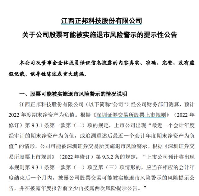 公告称,正邦科技公告,经公司财务部门测算,预计2022年度期末净资产为负值,公司可能被深圳证券交易所实施退市风险警示。公司已启动预重整,但公司能否进入重整程序存在不确定性。