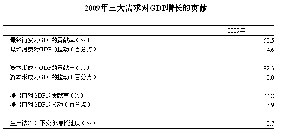 2月2日,国家统计局公布2009年三大需求(消费、投资和出口)对GDP增长的贡献,数据显示:2009年,最终消费对GDP的贡献率52.5%,拉动GDP4.6个百分点;资本形成(投资)对GDP的贡献率92.3%,拉动GDP8.0个百分点;净出口对GDP的贡献率-44.8%,拉动GDP-3.9个百分点。