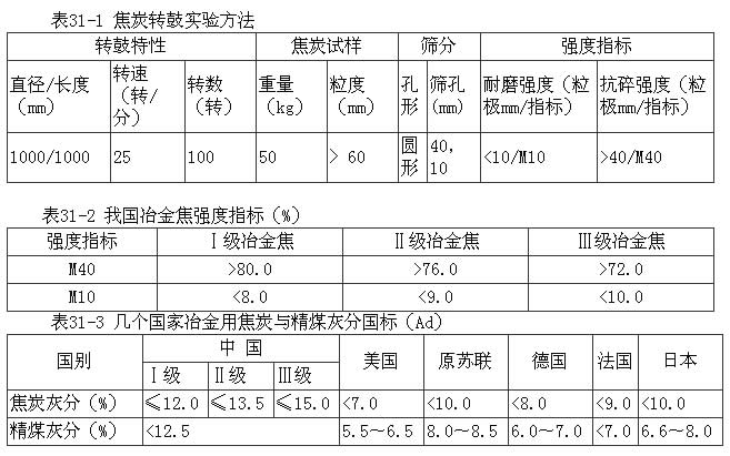 焦炭是高温干馏的固体产物,主要成分是碳,是具有裂纹和不规则的孔孢结构体(或孔孢多孔体)。裂纹的多少直接影响到焦炭的力度和抗碎强度,其指标一般以裂纹度(指单位体积焦炭内的裂纹长度的多少)来衡量。衡量孔孢结构的指标主要用气孔率(只焦炭气孔体积占总体积的百分数)来表示,它影响到焦炭的反应性和强度。不同用途的焦炭,对气孔率指标要求不同,一般冶金焦气孔率要求在40~45%,铸造焦要求在35~40%,出口焦要求在30%左右。焦炭裂纹度与气孔率的高低,与炼焦所用煤种有直接关系,如以气煤为主炼得的焦炭,裂纹多,气孔率高,强度低;而以焦煤作为基础煤炼得的焦炭裂纹少、气孔率低、强度高。焦炭强度通常用抗碎强度和耐磨强度两个指标来表示。焦炭的抗碎强度是指焦炭能抵抗受外来冲击力而不沿结构的裂纹或缺陷处破碎的能力,用M40值表示;焦炭的耐磨强度是指焦炭能抵抗外来摩檫力而不产生表面玻璃形成碎屑或粉末的能力,用M10值表示。焦炭的裂纹度影响其抗碎强度M40值,焦炭的孔孢结构影响耐磨强度M10值。M40和M10值的测定方法很多,我国多采用德国米贡转鼓试验的方法。如表31-1所示。 转故试验完成后,用孔径为40mm和10mm的筛子筛分,大于40mm粒级的百分数为M40值,小于10mm粒级的百分数为M10值。我国冶金焦规定的强度指标见表31-2。 |