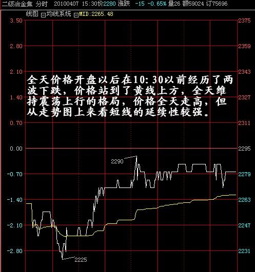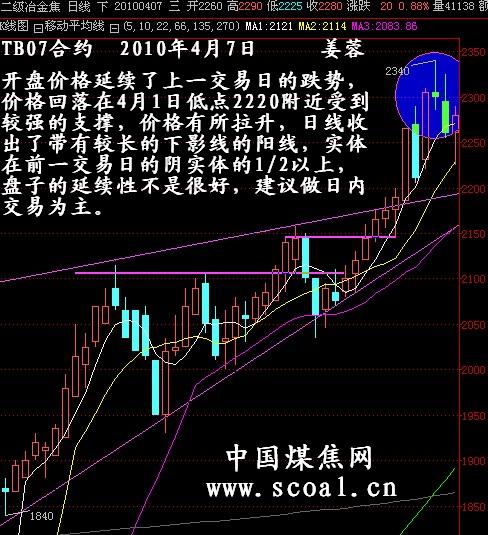 基本面 本周国内焦炭市场活跃,市场价格持续上调,现山西、山东、河北等主导城市二级冶金焦含税出厂价分别为:1830元、1900元、1900,小幅上调30-60元。周内焦炭市场运行基本正常,大部分焦化厂内冶金焦库存不多,钢厂对焦炭的需求有明显增多迹象,再加上钢材市场近期的火爆行情,使得多数焦化企业有涨价的念头。另外,本周国内煤矿事故频发,导致许多要开工的煤矿推迟生产期,在有关部门加紧对煤矿事故的调查和整顿的过程中,炼焦煤资源明显供不应求,同时推动了炼焦煤市场价格。在原料成本加大的前提下,焦炭市场涨价呼声更为强烈,部分主导地区也发布了最新指导价。本周山东焦协发布最新指导价格,自2010年4月1日起,二级冶金焦市场指导价为1900元,一级冶金焦市场指导价为2000元;山西焦协提出4月份焦炭质量和价格的指导意见:质量以硫份≤0.7、灰份≤12.5的焦炭为基准,焦炭指导价(车板含税)1950元/吨。预计,近期焦炭市场持续走好,整体市场仍有一定上升空间。 技术面 TB07合约2010年4月7日