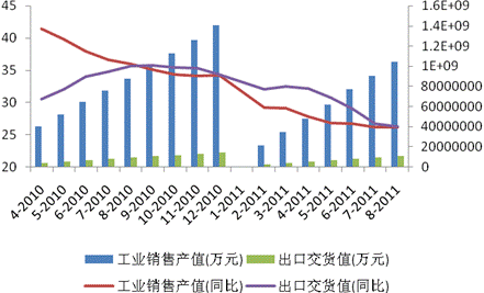 机械方面,由于先前4万亿的经济刺激计划中,存在大量的基建项目,这也促发了2010年机械行业的全面大爆发,2010年全年机械工业销售值超过34%,单月来看除了9、10月份同比增速为29%外,其余月份都以超过30%的增速运行。出口同样表现优越,运行轨迹基本和整体机械工业产值相近,可以说,2010年是2008年金融危机以来表现最为优越的一年。