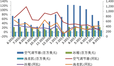 对于家电出口而言,在外围需求不断萎缩的情况下,汇率的波动也将进一步蚕食家电出口原本微薄的利润空间。由于家电出口的业务周期较长,从合同确认,到发货、收款长达3至6个月,一旦汇率波动,将加剧家电企业海外出口的利润不确定性。抛开本已节节败退的外需不计,使得面对出口平均利润不足10%的家电企业更加举步艰难。