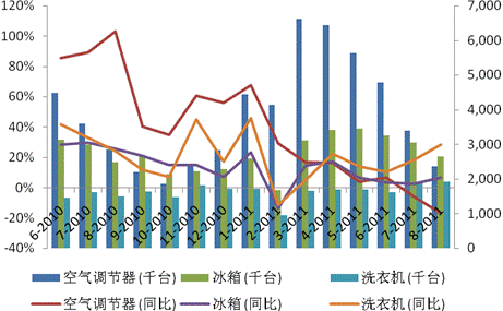受欧美经济放缓影响,对于主要家电企业出口占比达30%的区域来说,家电行业也深受影响。我们以主要家电出口数量和金额分别来看,出口数量方面,空气调节器7、8月份同比负增长,冰箱连续4个月个位数增长。金额方面,空气调节器8月同比个位数增长,去年同期出口增速达115%。冰箱出口增长15%,去年同期增长23%,洗衣机增长29%,去年同期为39%。