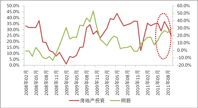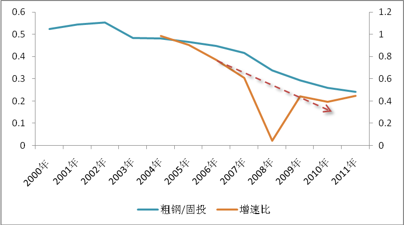 首先,我们来看看需求基本面的情况,当我们把历年的粗钢产量和城镇固定资产投资放在一起比较时,我们不难发现,随着近些年城镇化加速以及08年以来大量上马的基建工程的实施,固定资产投资拉动的粗钢生产在持续下降。亿元城镇固定资产投资带动的粗钢产量已由2000年的0.52万吨下降至2010的0.26万吨(2011年1-10月为0.24万吨),投资对钢材的单位消费出现了明显的下滑。