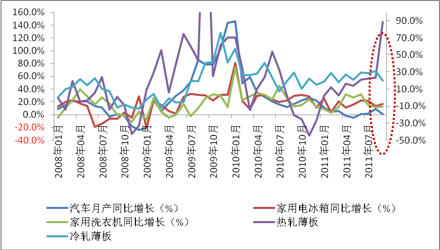 汽车生产今年遭遇滑铁卢,今年产量增速可能锁定在3%左右的估值下限,其增速只为去年的1/10。家电方面整体表现尚可,不过四季度后包括冰箱、空调在内的家电开始进入销售淡季,而整个家电生产也将进入低速期,全行业都以消化库存为主。