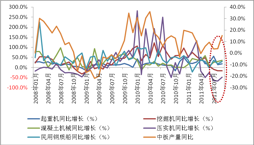 从具体终端需求来看,包括起重机、挖掘机和压实机等机械生产,在近几个月产量增速持续回落或者负增长,而造船行业尽管完工尚可,但是其产量增速却表现的不够稳定,起伏较大。