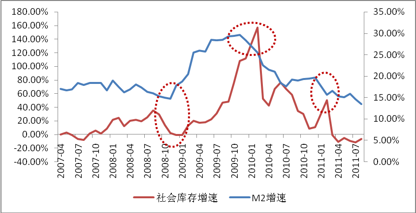 特别是把M2和社会库存做了比较之后,我们发现08年下半年开始,M2的走势和库存走势相当接近,而且一般领先于库存走势3-5个月左右。笔者认为这正是大量的信贷量以钢材社会库存的表现形式的存在。