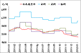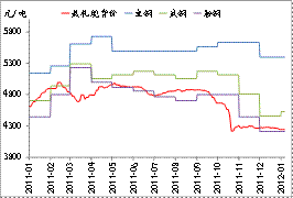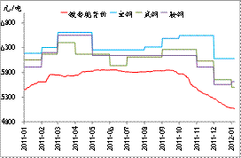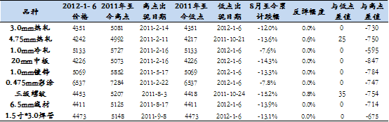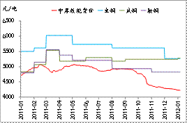现货市场 过去的2011年,钢材市场终究没有出现奇迹,最终在惨淡中收官。进入2012年,钢价仍延续了前期的跌势,多个品种击破2011年年内低点,再创新低。虽然10月底螺纹、线材曾出现过一波短暂的反弹,但受季节性因素及宏观政策调控的影响,上涨动力不足,很快便掉头向下。除冷轧、彩涂跌幅略小外,其余各品种跌幅大多在10%以上,螺纹、中板的跌幅更高达15.2%和14.3%。行情低迷,加之春节假期临近,贸易商无心恋战,采购意愿较弱,多以观望为主。在这样的情况下,钢厂上调出厂价或多或少会面临市场的压力,平盘不失为一个较为稳妥的选择。