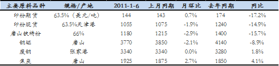 成本及盈利 临近春节,钢厂有补库存的需要,带动矿石价格小幅上涨。截至1月6日,63.5/63%印粉价格小涨0.7%至144美金/吨。尽管钢材市场不景气制约了铁矿石的上涨高度,但总体来看,铁矿石的价格依然坚挺。其他的原料相对铁矿石而言,走势较为平稳。总体来看,成本有略有上涨。