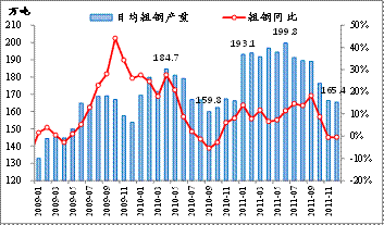 供需 12月我国粗钢产量为5128.6万吨,同比降低0.5%。当月日均粗钢产量为165.44万吨,环比下降0.5%,比6月高点减少了18.1%,回落幅度较大,这主要是由于前期钢厂限产较为普遍。11月下旬以来,尽管部分小钢厂逐渐有所复产,但回升空间不大。总体来看,供给压力有所减轻。