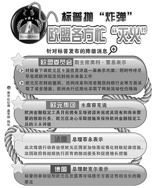 《法兰克福汇报》14日的文章说,标普降级使欧元危机进一步恶化,欧元区内核心国家同边缘国家分化更加严重。救助欧元区的成本势必增加,看来欧洲中央银行要准备金融“火箭炮”(即准备大规模购买危机国家国债)了。