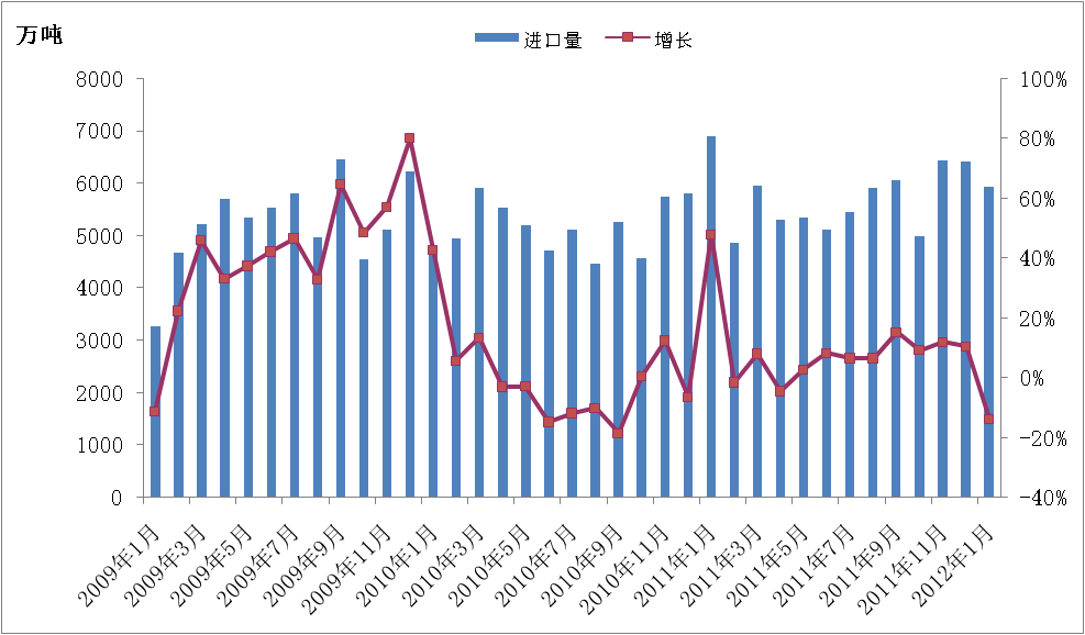 2012年1月份我国进口铁矿石5932万吨,比上个月减少477万吨,同比减少13.90%。(Mysteel综合资讯部编辑)
