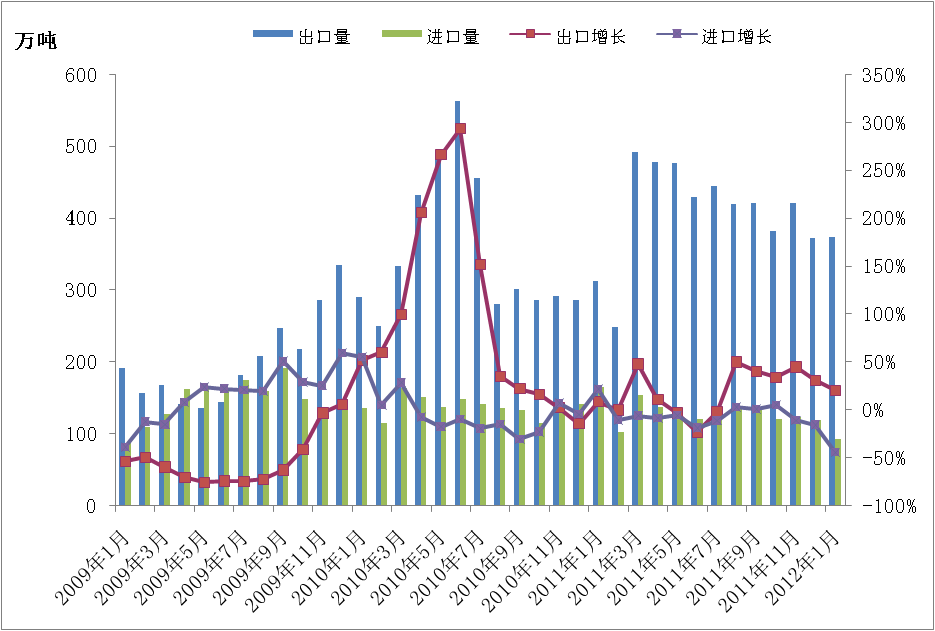 2012年1月份我国进口钢材92万吨,较去年12月份减少27万吨,比去年同期下降44.10%。