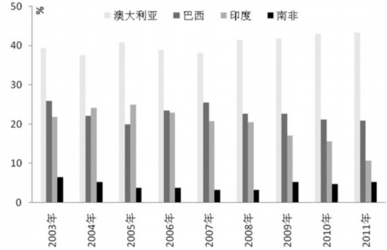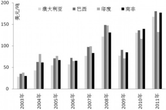由于在铁矿石定价上缺乏话语权,所以我国不断试图采取多元化、多渠道的进口机制,以打破被三大矿企垄断的局面。图2显示,我国从其他国家进口铁矿石的比例出现了明显增加。2007年我国从澳大利亚、巴西、印度以外的其他国家进口铁矿石占总进口量比重为15.79%,到2011年这一比例上升至25.31%,增加了近10个百分点。以南非为例,最近几年我国从南非进口铁矿石数量逐渐增多。不过据了解,南非矿品位低于澳大利亚、巴西和印度,通常在55%左右,虽然南非矿产资源位居非洲前列,但是和澳大利亚、巴西和印度三国相比,储量相对偏低。此外由于路途偏远,运费偏高,价格上没有明显优势。2011年我国从南非进口的铁矿石平均价格为177.17美元/吨,低于巴西180.21美元/吨的平均价格,但远远高于印度132.28美元/吨的价格,所以我国从南非进口铁矿石数量虽然有一定增加,但是增长幅度依然比较缓慢,2007年—2011年仅提升了2个百分点。