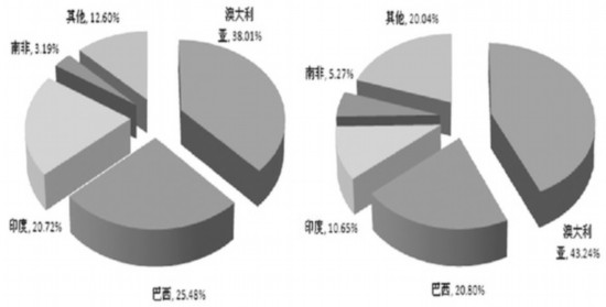 我国进口的铁矿石主要来自澳大利亚、巴西和印度。2011年我国累计进口铁矿石6.86亿吨,其中从澳大利亚进口2.97亿吨,从巴西进口1.43亿吨,从这两个国家进口的数量占我国铁矿石进口总量的2/3左右。最近几年,从澳大利亚进口铁矿石数量所占比重呈逐年递增趋势,而从巴西进口数量则出现了小幅回落。印度作为我国铁矿石第三大进口国,其出口数量也呈现持续下滑态势。