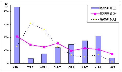 在新增粗钢产能方面,2011年下半年,新开工、新设计、新规划炼钢产能分别为420万吨、736万吨和127万吨,较上半年分别大幅下降80%、32.3%和81.3%,处于近年来最低水平,与此同时,采、选矿投资持续增加。下图为2008年以来各时间段新开工、新设计、新规划炼钢产能情况。企业已从单纯追求扩大产能向技术改造、资源开发、循环经济方向发展,抑制产能过剩、加快产业结构调整已经成为共识。