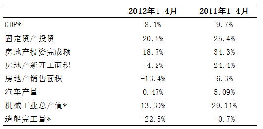 随着一季度和4月份经济数据的公布,钢材市场对下游需求增长的市场预期开始转为悲观,基础设施建设、房地产、汽车、机械、造船等主要用钢下游情况仍未有明显好转。与去年同期对比,各主要指标的增速下滑都非常明显,其中房地产新开工和销售面积、造船完工量、铁路建设投资等指标同比甚至出现了负增长。一季度宏观经济低位运行,二季度预计仍处于筑底过程,三季度之后可能才将有所起色。