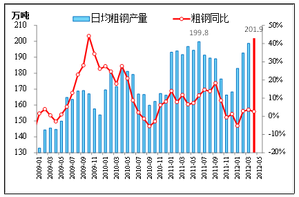 供给方面,4月份国内日均粗钢产量再创新高,供大于求压力较大。钢铁行业目前除了国内外宏观经济放缓的“外患”之外,行业自身的“内忧”也是行业持续低利润的关键因素,其中最主要的就是产能过剩。据Mysteel统计,2011年我国新上高炉63座,2012年预计还将至少新增高炉34座,两年的新增产能就超过了1亿吨。据发改委统计国内钢铁产能已经达到9亿吨。在此背景下,4月份日均粗钢产量创下201.9万吨(年化7.37亿吨)的新高也就不足为奇了。