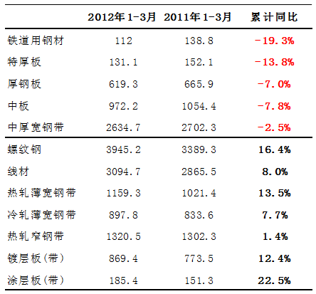 图表3 今年1-3月各主要钢材品种产量增幅对比