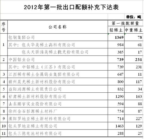 此外,据介绍,江苏卓群纳米稀土股份有限公司、阜宁稀土实业有限公司、常熟市盛昌稀土科技有限公司(原常熟市盛昌稀土冶炼厂)已与中国铝业公司控股股东共同组建了中铝稀土(江苏)有限公司。应上述企业要求,江苏卓群纳米稀土股份有限公司、阜宁稀土实业有限公司、常熟市盛昌稀土科技有限公司的出口配额统一转至中国铝业公司下属中铝稀土(江苏)有限公司。