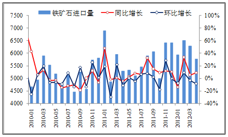 铁矿石进口量高位,粗钢产量本年度次新高,预计这种高位的产量压力短期内还将持续。5月铁矿石进口量10401.9万吨,环比虽然出现了下降,表明进口量达到峰值后出现了缓慢回落。但同比仍旧处于高位,预计将呈现逐步减少的态势,但减少的幅度要看需求的具体变化而定。同时消化还需时间。本月粗钢产量创下了本年度次高位,随着经济增速将逐步恢复,多项基建项目开工加速将对钢铁产品的需求形成一定增长,这也在另一方面对生产的持续高位形成支撑。预计这3季度的产量仍将处于高位,即使有所下降幅度也不会太大。钢厂方面,目前钢铁行业产能过剩、开工率较高,检修情况较少,尚未形成大范围内减产。