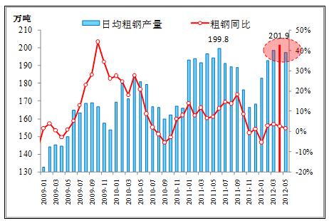 近日,国家统计局公布了5月份粗钢产量为6123万吨,日均粗钢产量197.5万吨,环比下降2.5%,为今年内的次新高。3月以来,产量开始处于高位,尽管统计方法的变更具有一定的影响作用,但按照目前公布的数据看来,供给压力明显。本文将根据粗钢产量这一供给面为出发点,结合钢铁行业下游需求变化,对市场进行简要分析。