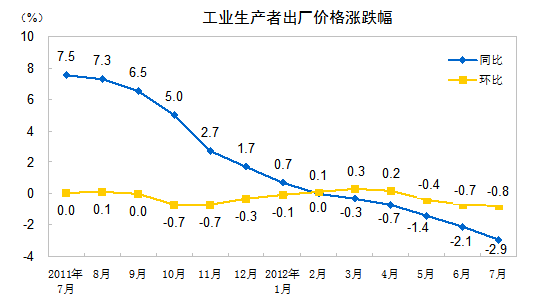 2012年7月份,全国工业生产者出厂价格同比下降2.9%,环比下降0.8%。工业生产者购进价格同比下降3.4%,环比下降0.8%。1—7月平均,工业生产者出厂价格同比下降1.0%,工业生产者购进价格同比下降0.8%。