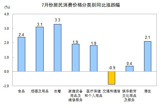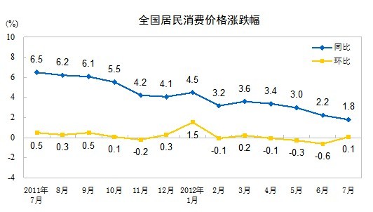 2012年7月份,全国居民消费价格总水平同比上涨1.8%。其中,城市上涨1.9%,农村上涨1.5%;食品价格上涨2.4%,非食品价格上涨1.5%;消费品价格上涨1.7%,服务项目价格上涨2.0%。1-7月平均,全国居民消费价格总水平比去年同期上涨3.1%。