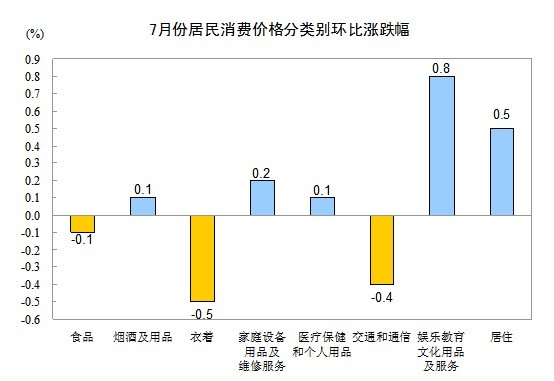 7月份,全国居民消费价格总水平环比上涨0.1%。其中,城市上涨0.1%,农村持平(涨跌幅度为0);食品价格下降0.1%,非食品价格上涨0.2%;消费品价格下降0.1%,服务项目价格上涨0.6%。