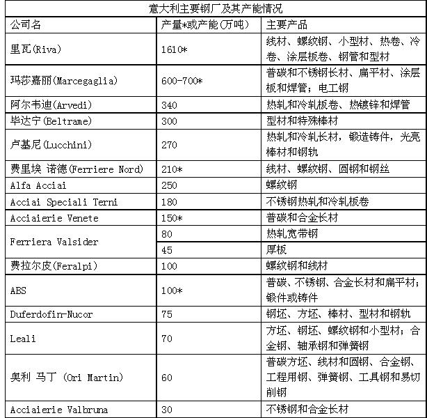 意大利钢铁业极为分散,与欧洲其他各国不同的是,该国钢铁企业几乎全是家族经营,大部分钢厂均以家族姓氏命名。意大利生产钢材的公司约有130余家,钢铁经销商和服务中心约有360家,废钢经销商超过400家。其中意大利最大的钢铁生产厂家里瓦集团主要的综合钢厂位于意大利塔兰托市。其他钢铁生产厂家大部分为电弧炉钢厂,如成立时间均比较悠久的玛莎嘉丽、毕达宁等分散在各个城市。另外,意大利很多大钢厂和加工厂还通过新建和扩建国内外钢厂以拓展市场份额。
