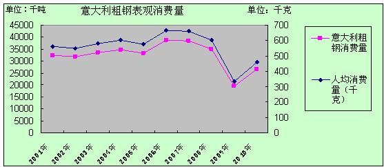 从2001-2010年的表现来看,2010年意大利粗钢表观消费量为2665万吨,较2009年的低谷1949.5万吨增长36.7%,但较2006年的峰值3872.9万吨下降31.2%。2010年意大利人均粗钢消费量为458.8千克,较2009年的低谷335.4千克增长36.8%,但较2006年的峰值666.2千克下降31.1%。