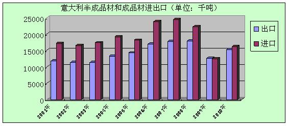 意大利是欧洲第一大钢铁进出口大国。2009年,意大利钢铁进口量为1255万吨,略低于出口量1275万吨。2010年,意大利钢铁进口量为1630.7万吨,而出口量为1531.6万吨,逆差为99.1万吨。从最近10年的表现来看,除2009年外,意大利历年钢铁进出口均处于逆差状态。