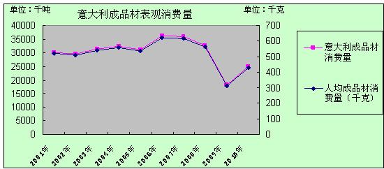 2010年意大利成品材表观消费量为2486.6万吨,较2009年的低谷1818.6万吨增长36.7%,但较2006年的峰值3605.9万吨下降31.0%。2010年意大利人均成品材消费量为428.1千克,较2009年的低谷312.9千克增长36.8%,但较2006年的峰值620.3千克下降31%。