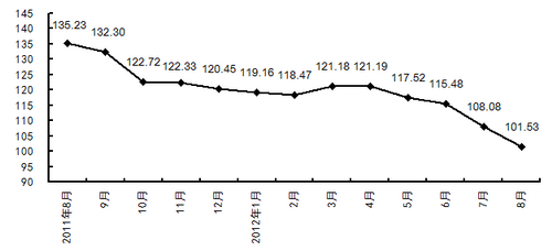8月末,中国钢铁工业协会CSPI钢材综合价格指数为101.53点,环比下降6.55点,降幅为6.06%,较上月降幅收窄0.35个百分点;与上年同期相比下降33.70点,降幅为24.92%。(见下图)