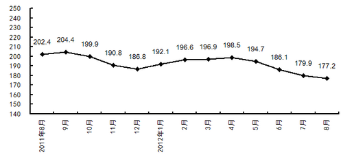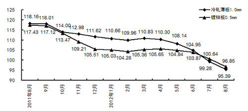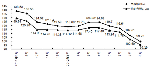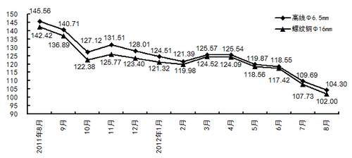 8月份,受固定资产投资和制造业增速回落影响,国内市场钢材需求仍延续疲软态势,钢材价格继续下跌。由于钢铁产量和社会库存有所下降,国家进一步出台稳增长措施,预计后期市场钢材价格会有所趋稳,但供大于求的市场状况难以扭转。