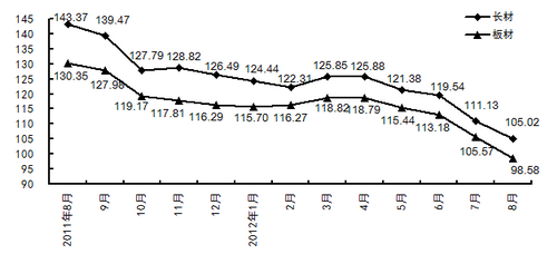 8月末,CSPI长材指数为105.02点,环比下降6.11点,降幅为5.50%,比上月降幅收窄1.54个百分点;板材指数跌破100点,为98.58点,环比下降6.99点,降幅为6.62%,比上月降幅收窄0.10个百分点;与去年同期相比,长材指数下降38.35点,降幅为26.75%;板材指数下降31.77点,降幅为24.37%。(见下图、下表)