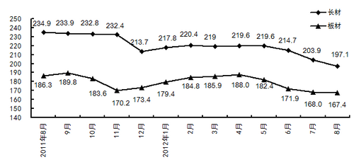 8月份,全国粗钢产量连续第二个月小幅下降,但受固定资产投资及制造业增速持续放缓等因素影响,国内钢材市场仍呈现为供大于求局面,钢材价格继续下跌。