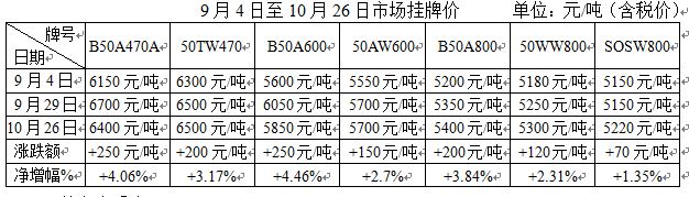 一、“B50A470A”今年9月初仅6150元/吨(含税,以下同)至9月29日涨至6700元/吨,净涨550元/吨,涨幅为8.84%,然而,出现回落至10月26日跌至6400元/吨。