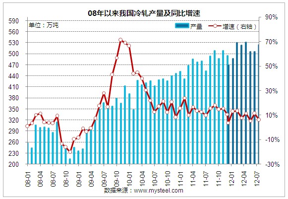 从以上数据不难看出,8月份我国冷轧价格加速下跌的根源仍在于供需的严重失衡,今年1-8月份我国冷轧产量一直居高不下,而汽车、家电等重点下游同比增速明显下滑,使得冷轧市场长期处在供大于求状态。另外,在国内需求不理想的情况下,国外市场也面临较大的市场压力,8月份我国冷轧出口大幅下滑,冷轧市场面临国内外需求低迷的双重压力。不过,随着全球经济的逐步恢复,预计9月份我国冷轧出口或明显回升。 |