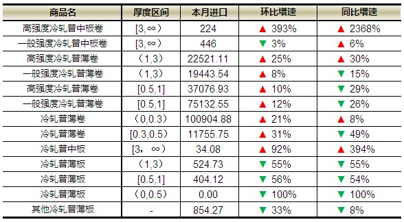 表三:8月份我国冷轧板卷进口明细及增速(单位:吨)