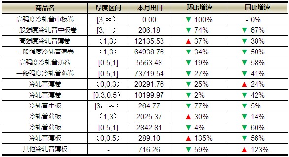从出口品质上看,8月我国冷轧出口量分化明显,其中3.0mm以上一般强度冷轧普中板卷环比降幅高达100%。不过,厚度0.5-1mm的冷轧普薄板环比增幅高达135%。