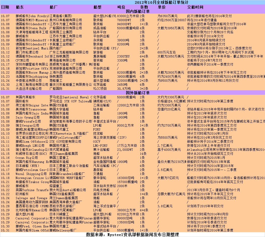 国内方面,2012年10月份新签船舶订单59条,较2012年9月份的数量增加了19条,船东仍以欧洲为主,部分为国内船东。其中,散货船新接订单数量有15条,比上月增加了7条;成品油船和集装箱船均有8条;高附加值的海工钻井平台有各9条,数量明显增加,其余多为低附加值的客船和旅游船。