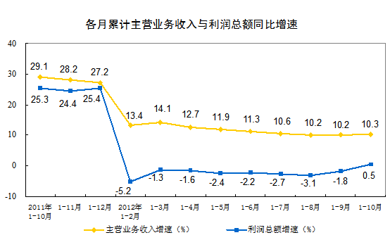 1-10月份,全国规模以上工业企业实现利润40240亿元,同比增长0.5%。10月当月实现利润5001亿元,同比增长20.5%。