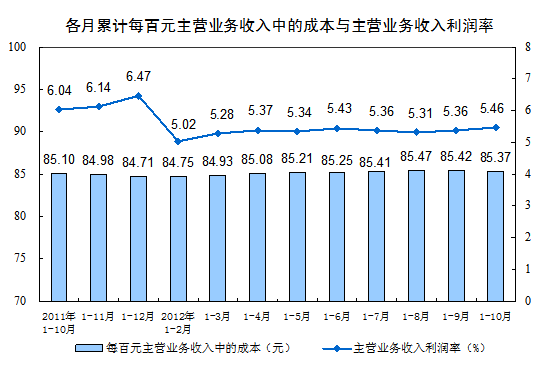 规模以上工业企业实现主营业务收入736970亿元,同比增长10.3%。每百元主营业务收入中的成本为85.37元,主营业务收入利润率为5.46%。